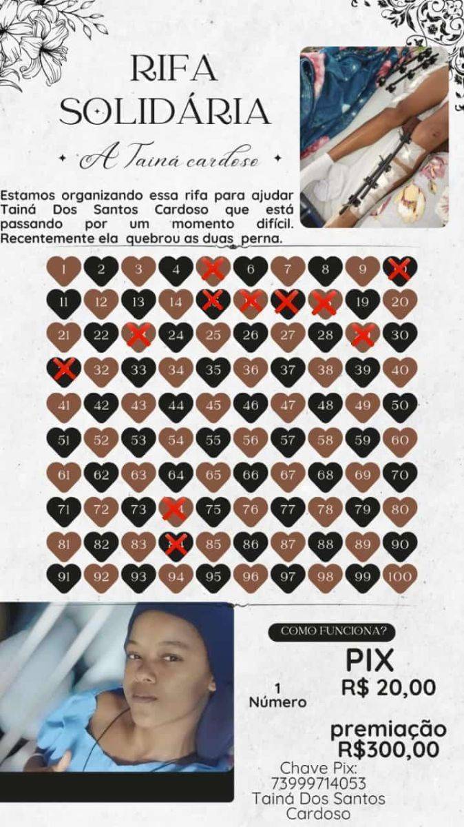 A situação é urgente! Taina sente muita dor e precisa de ajuda para comprar itens de higiene pessoal, medicamentos e, futuramente, custear tratamentos como fisioterapia. A família está organizando uma vaquinha e rifas para arrecadar fundos e conta com a solidariedade de todos.