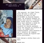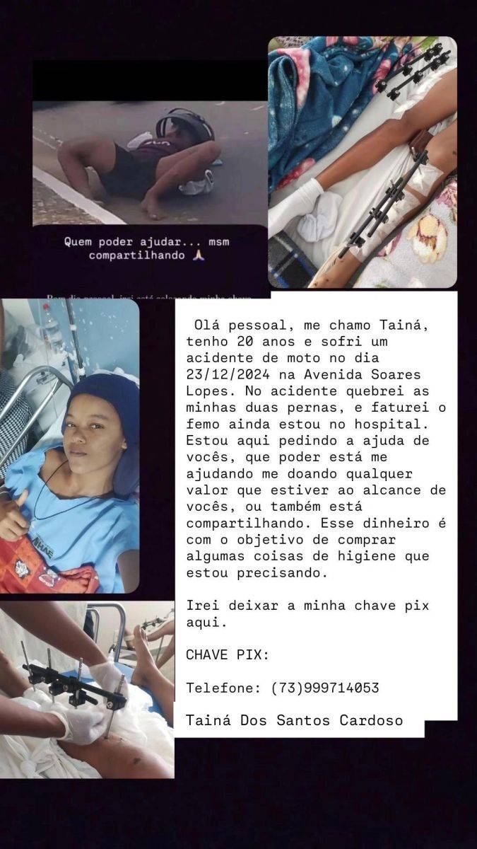 No dia 23/12/2024, Taina Cardoso, de apenas 20 anos, sofreu um grave acidente na Avenida Soares Lopes enquanto estava de carona com seu primo. Infelizmente, ela quebrou as duas pernas e fraturou o fêmur. Desde então, Taina está internada no hospital, aguardando uma cirurgia que tem sido constantemente desmarcada.