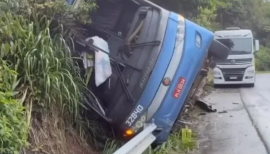 Um ônibus da Viação Águia Branca tombou na madrugada deste sábado (4), por volta da 1h30, no km 359 da BR-101, em um trecho do município de Wenceslau Guimarães. O coletivo fazia a linha Teixeira de Freitas x Salvador e transportava 35 passageiros.