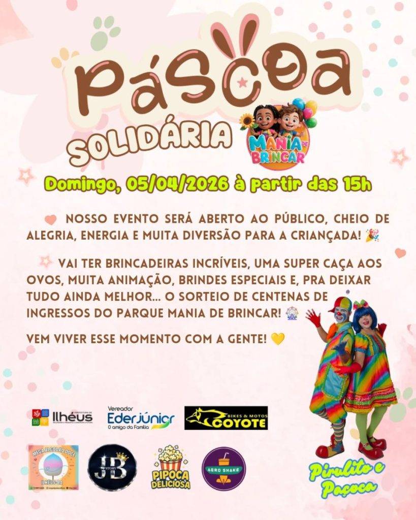 Uma programação especial voltada para o público infantil será realizada neste domingo, 5 de abril, a partir das 15h, no Espaço Mania de Brincar, na Avenida Soares Lopes, em Ilhéus. A “Páscoa Solidária” chega com a proposta de oferecer uma tarde de lazer, integração e atividades recreativas abertas ao público.